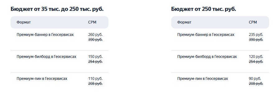 Здесь можно разместить премиум-форматы в геосервисах Яндекса со скидкой до 50% на CPM. В числе доступных форматов: