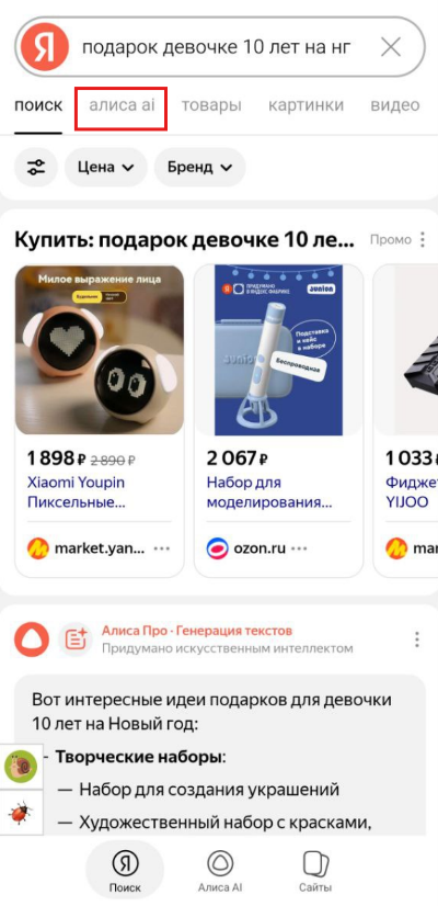 Пользователь может перейти в чат с Алисой AI, не покидая страницу с поисковой выдачей |