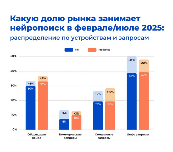 Пользователи стали чаще применять нейропоиск и на мобильных, и на десктопных устройствах. Так, общая доля нейрозапросов с ПК составила 30%, а с мобильных устройств — 33%. Чаще всего в нейропоиск попадают: