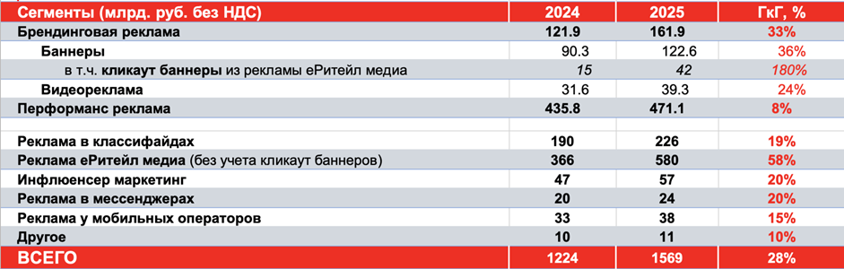 Сегмент «Другое» (включая аудиорекламу) — 11 млрд рублей (+10%). Небольшой, но устойчивый рост.