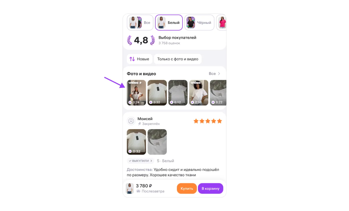 Закрепленные вайбы отображаются над отзывами: покупатели увидят их первыми в блоке «Фото и видео» на странице товара.