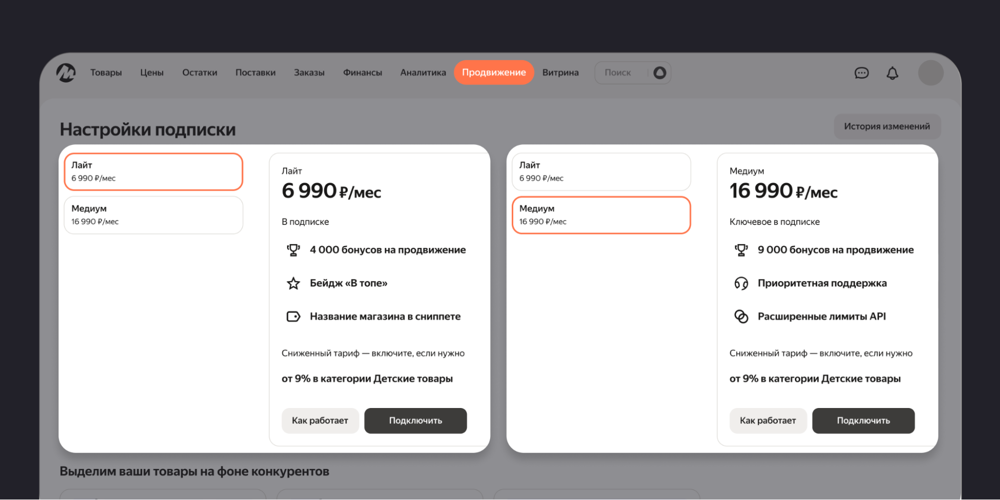Медиум. Содержит те же шесть форматов визуального выделения, но дает 9000 бонусов на рекламу. Дополнительно селлер получает приоритетную поддержку и увеличенные лимиты API. Этот тариф подойдет продавцам с широким ассортиментом — для автоматизации процессов. Стоимость — 16 990 рублей в месяц.