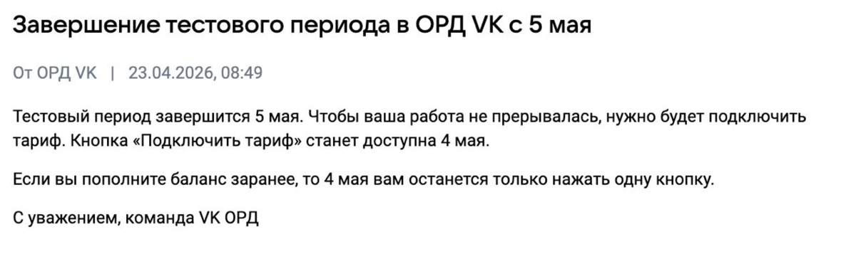 Завершение тестового периода ОРД VK — сервис переходит на платную модель с 5 мая |