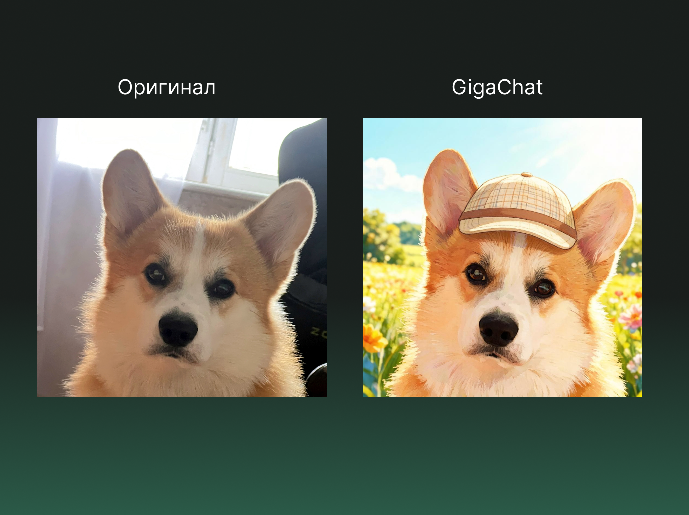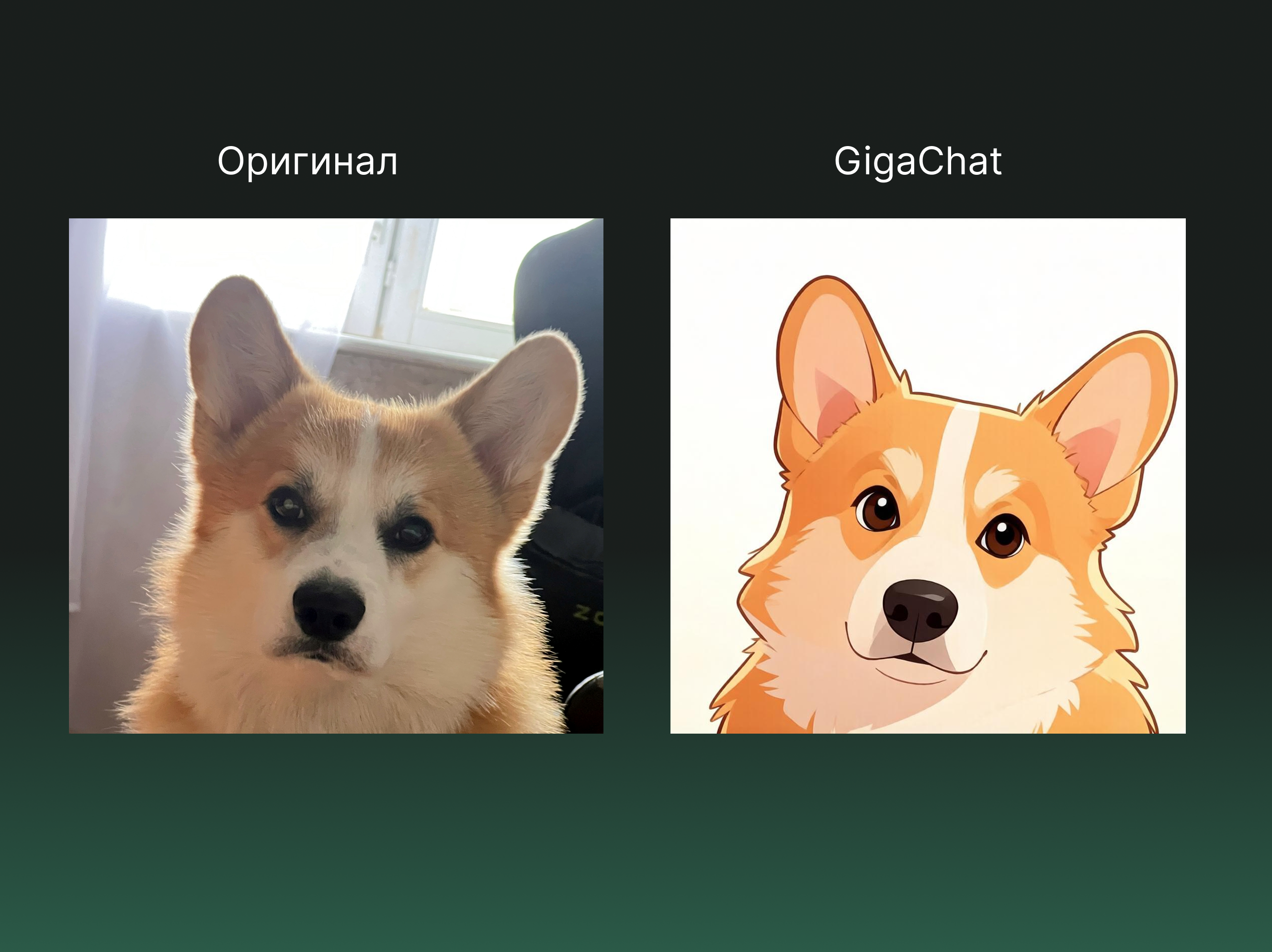 Источник: результат генерации в GigaChat Итог: корги в стиле мультфильма получился неплохим, но нейросеть не сгенерировала фон — он остался белым.