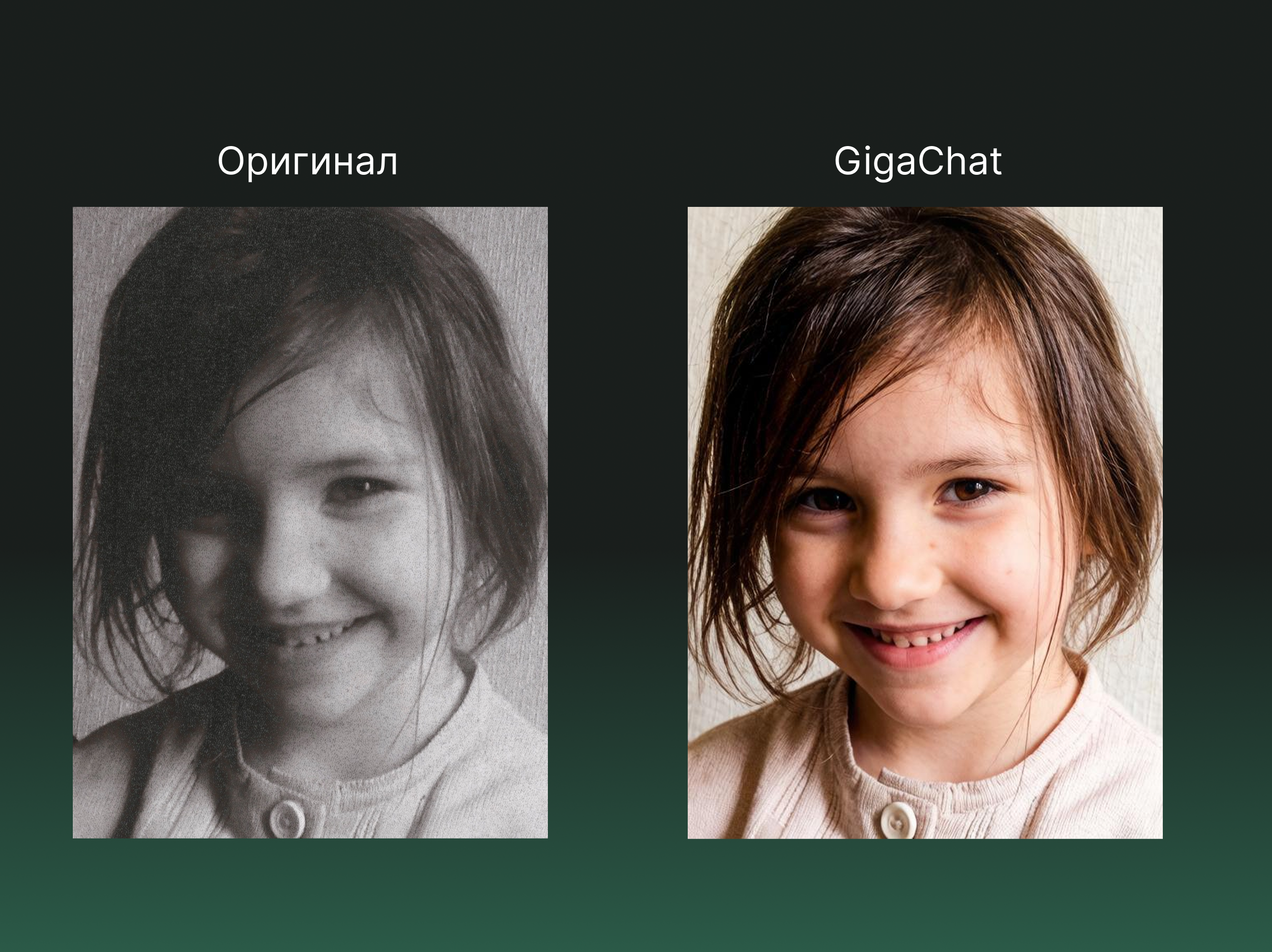 Источник: результат генерации в GigaChat Итог: фото стало четким, цвет передан корректно и выглядит естественно. Черты лица немного изменились по сравнению с оригиналом, однако общие пропорции и узнаваемость в целом сохранены.