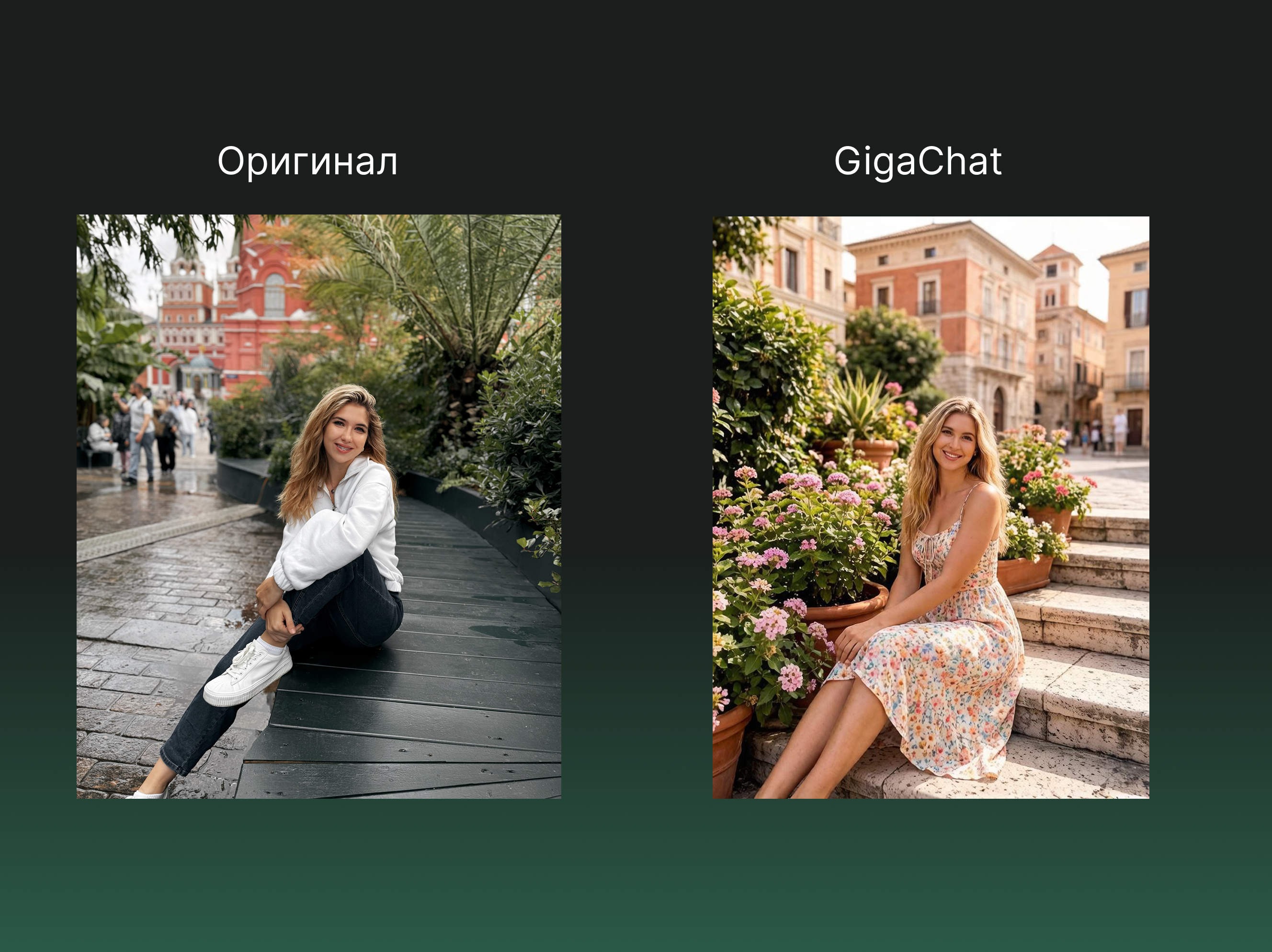 Источник: результат генерации в GigaChat Итог: нейросеть заменила не только окружение, но и модель.