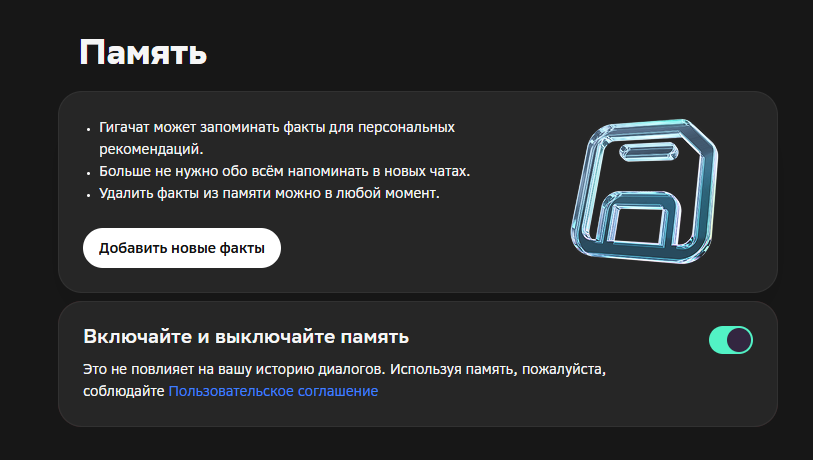 Долгосрочная память. Нейросеть запоминает информацию о пользователе между сессиями и применяет ее в последующих разговорах. В памяти остается всё, чем пользователь поделился: от увлечений до личных данных. Функция управляется через настройки профиля — ее можно включить или отключить в любой момент.
