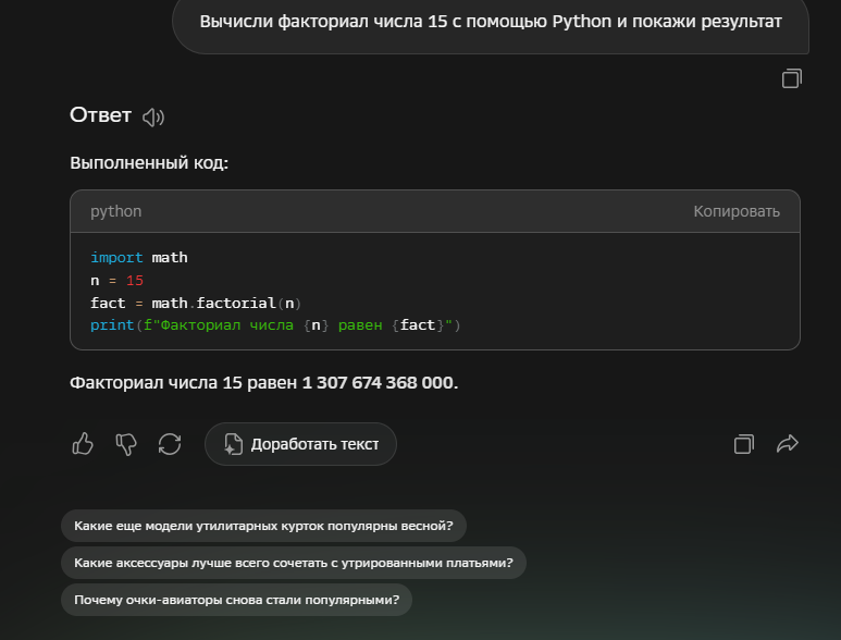 Код-интерпретатор. В ИИ-помощник встроили кодовый интерпретатор — теперь код можно не только писать, но и сразу запускать в безопасной изолированной среде без сторонних инструментов. Раньше такой возможности не было. Интерпретатор работает с файлами, делает сложные вычисления, проверяет данные и строит графики прямо в чате.