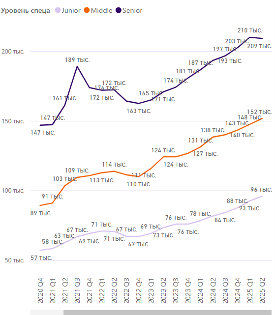 Также в исследовании показана динамика зарплат по уровню специалистов за 2020–2025 годы. По ней видно, что в 2025 году зарплаты в digital достигли максимального уровня.