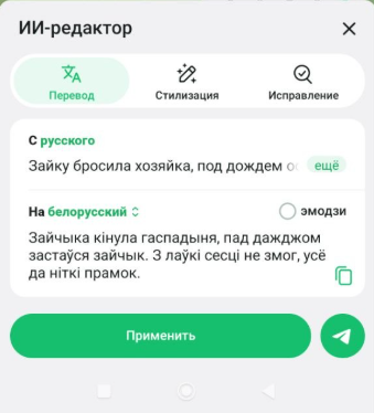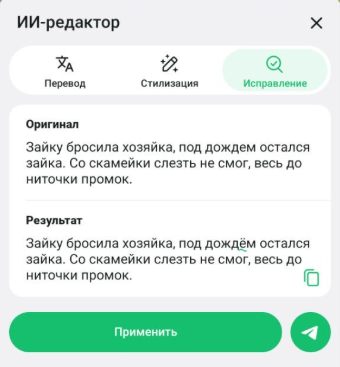 Переписывать текст в выбранном стиле: «Формальный», «Короткий», «Племенной», «Корпоративный», «Дзен», «Библейский», «Викинг».