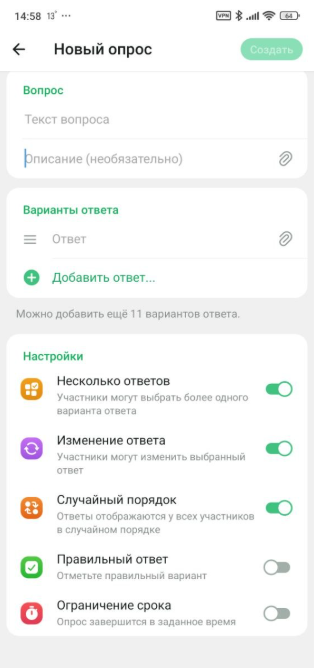 Второе обновление — улучшенные опросы. Разработчики добавили более 10 новых функций для опросов. Теперь можно прикреплять медиафайлы к вопросам и вариантам ответов, добавлять описание, разрешать участникам предлагать свои варианты, добавлять таймер и пр.