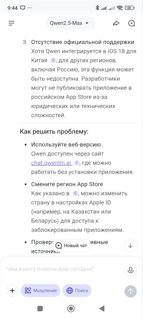 В сети сообщается, что приложение Qwen доступно и на Android, и на iOS. Однако у нас скачать нейросеть на iOS не вышло — она недоступна в стране или регионе. А вот на Android скачать Qwen можно.
