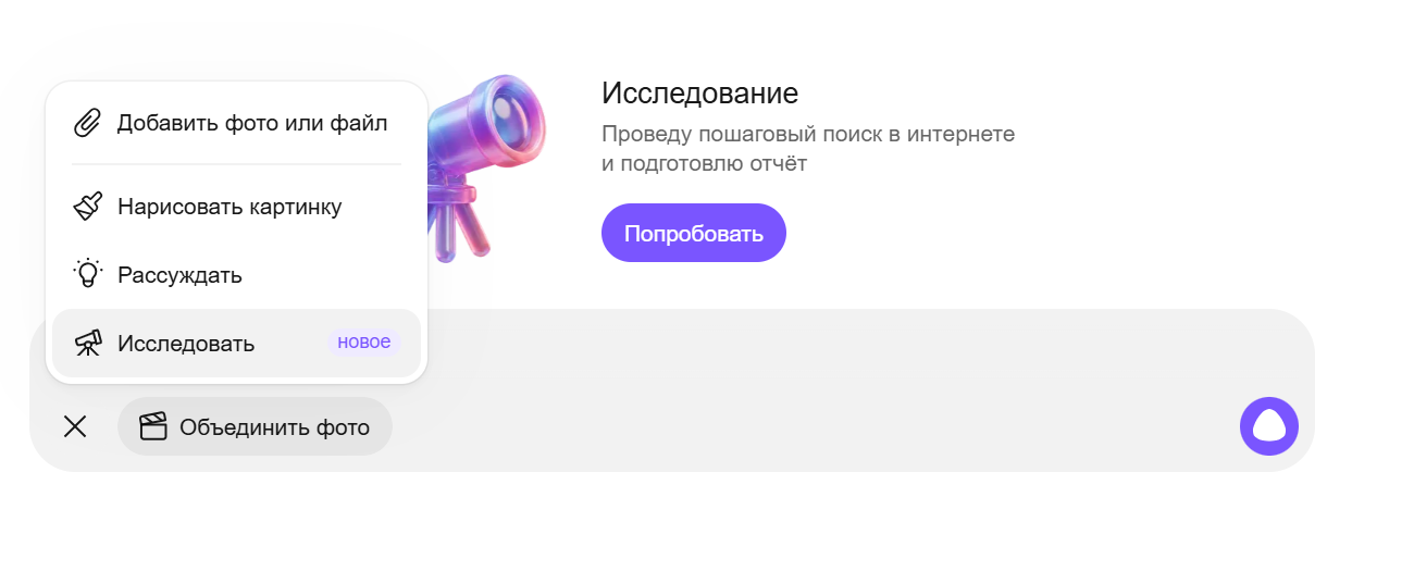 В чате с Алисой AI нажать на «+» и выбрать режим «Исследовать».