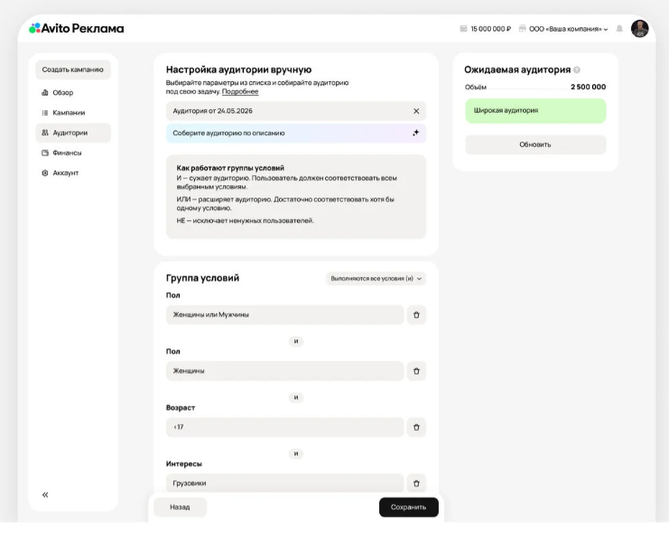 В кабинете Авито Рекламы появился раздел «Аудитории» с возможностью создавать собственные таргетинги. Теперь бизнес может не только использовать готовые шаблоны, но и формировать сегменты под ключ — от простых параметров до сложных вложенных правил, загружать обезличенные CRM‑данные и находить пользователей, похожих на текущих клиентов, сообщается в блоге Авито Рекламы.