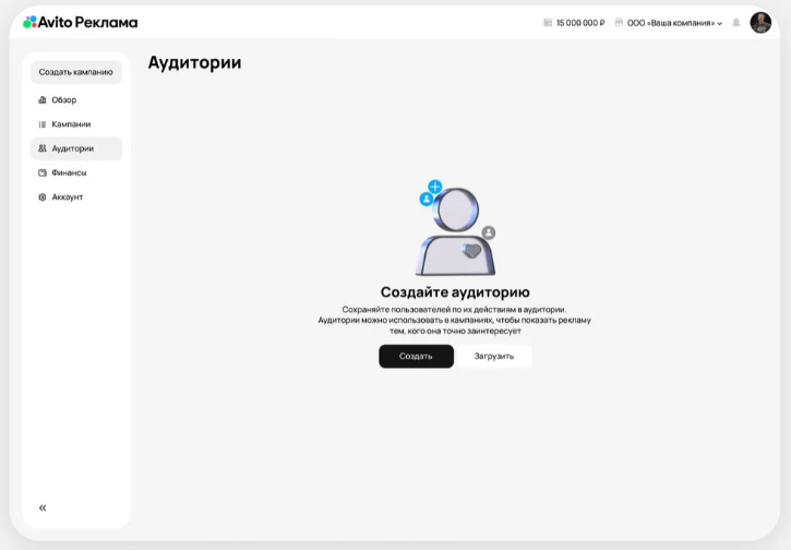 Раздел «Аудитории» в кабинете Авито Рекламы для сбора кастомных сегментов аудиторий |