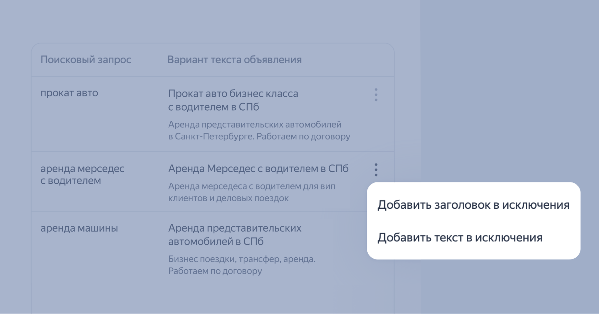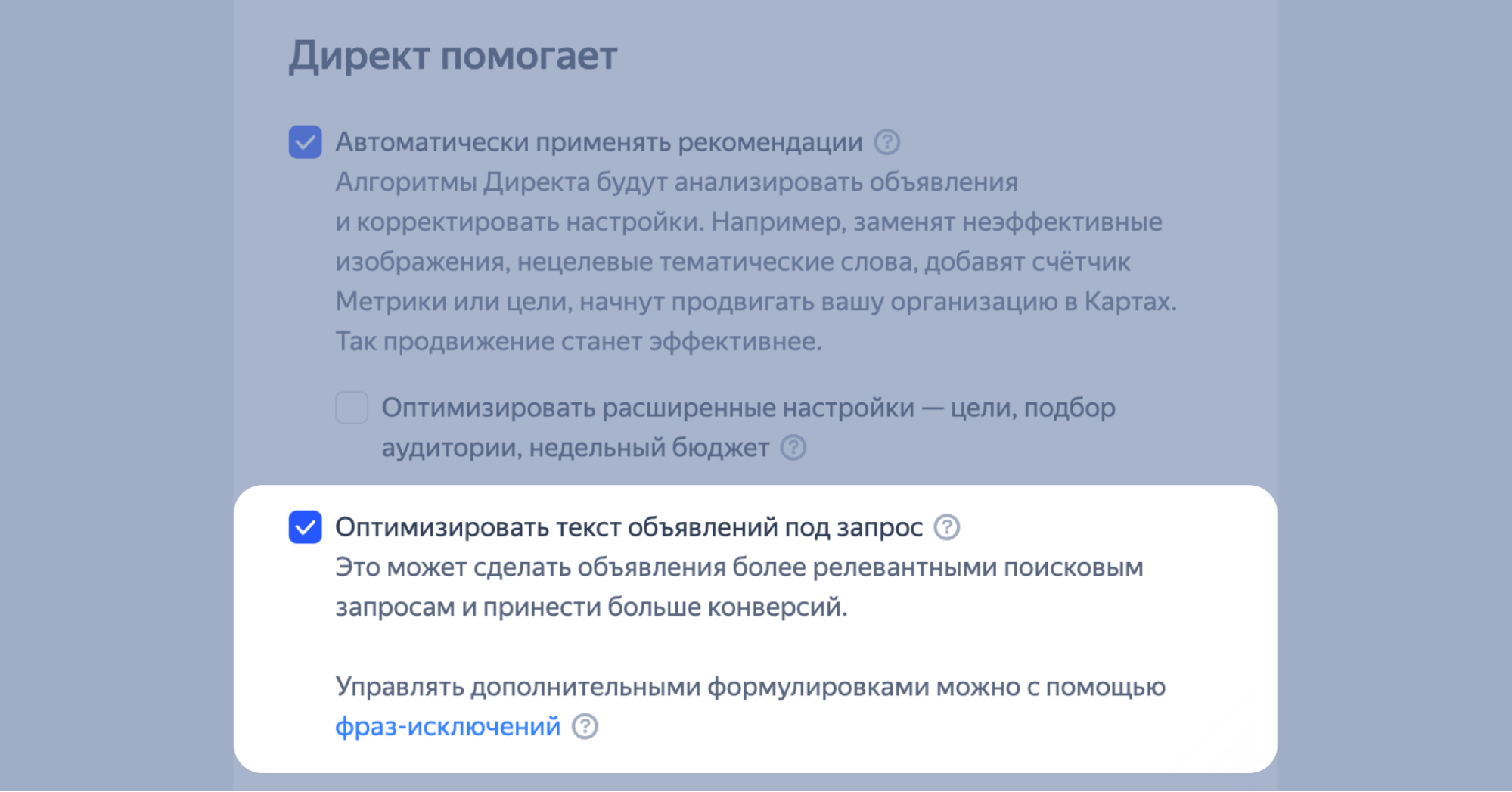 Возможность управлять опцией «Оптимизировать текст объявлений под запрос» с помощью фраз-исключений |