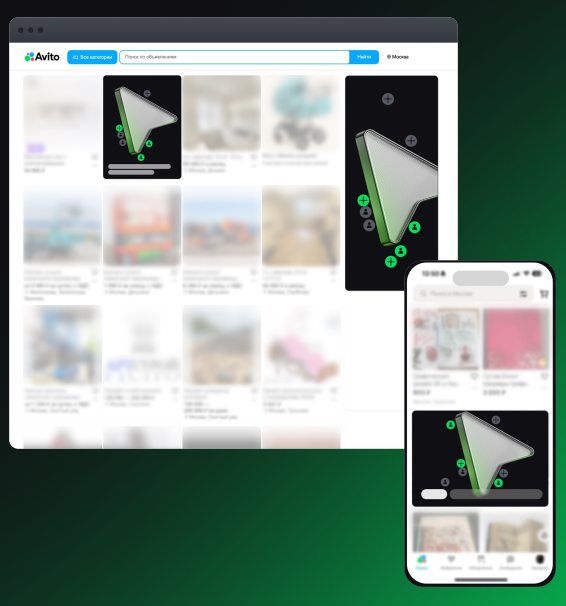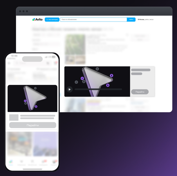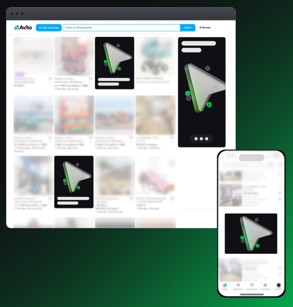 нативный баннер выглядит как стандартное объявление на Авито, но с кликабельным логотипом, текстом, картинкой и кнопкой.
