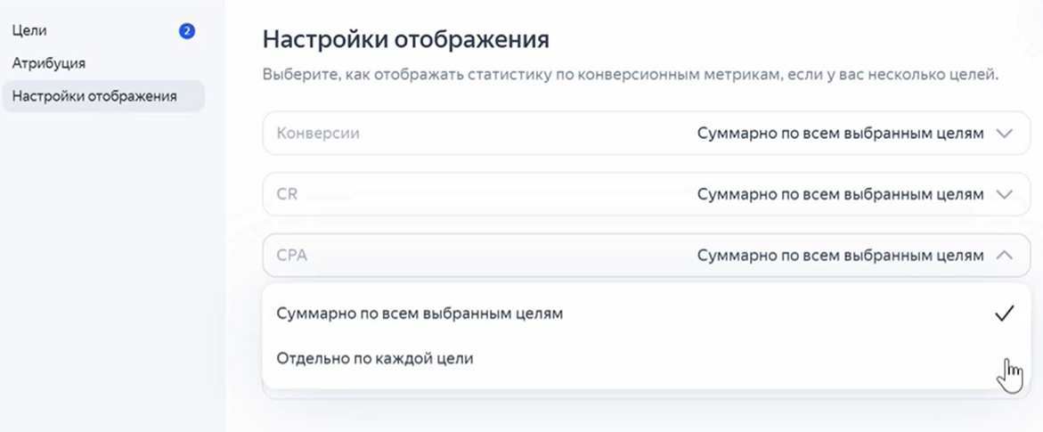 разбивать отображение статистики по нескольким целям или, наоборот, выводить эти данные вместе;