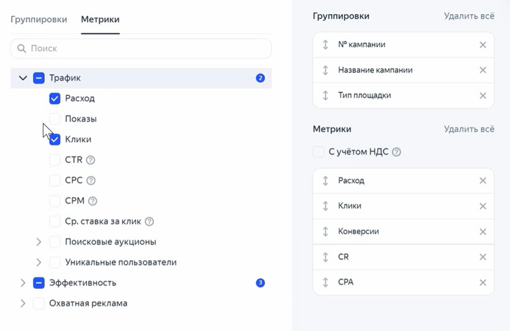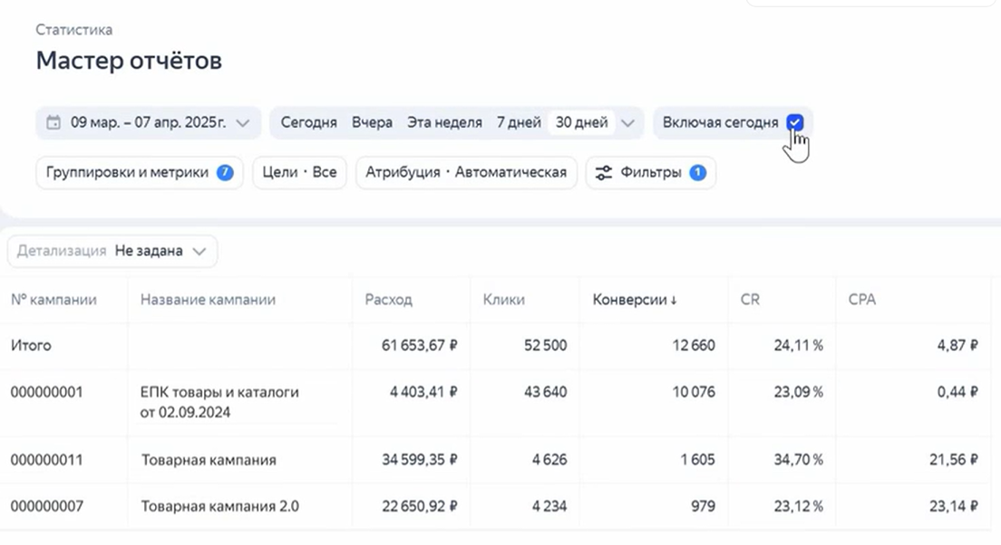 для анализа эффективности (конверсии, CR, СРА, ДРР и др.);