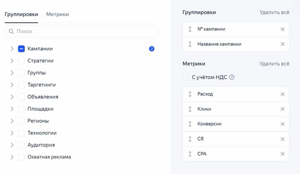 По умолчанию в новом Мастере отчетов выбраны базовые настройки — их можно скорректировать с учетом своих задач. Для этого нужно: