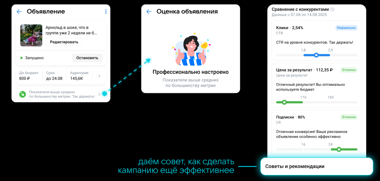 Команда VK Рекламы отмечает, что функционал будет полезен как опытным пользователям VK Рекламы, так и новичкам. Сравнение с конкурентами доступно объяснит, насколько хороши или плохи показатели, выявит слабые места кампаний и покажет возможные точки роста.