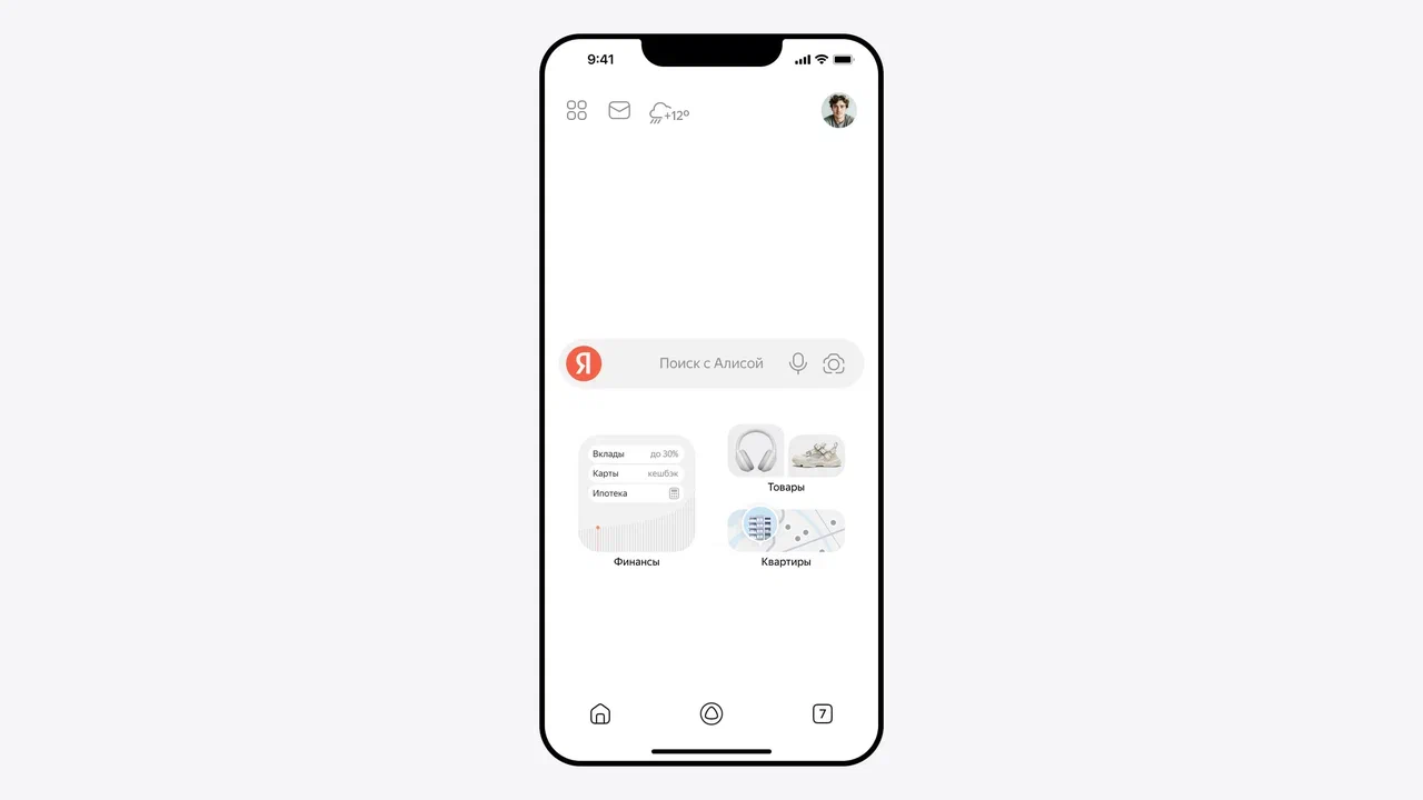 Разделы «Квартиры», «Финансы» и «Товары» в Поиске Яндекса (мобильное приложение) |
