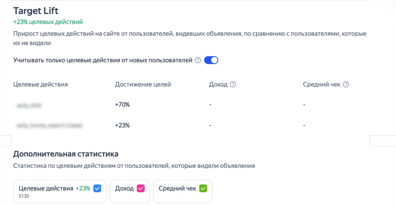 Еще одно обновление: в исследовании Target Lift для всех медийных кампаний теперь можно отследить, как реклама повлияла на целевые действия новых пользователей, то есть тех, кто не совершал на сайте целевых действий в течение полугода (также вскоре станут доступны периоды в 1, 3 и 12 месяцев). Опция доступна и при использовании новой корректировки, и без нее — достаточно включить тумблер.