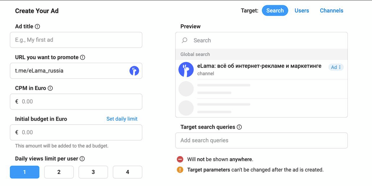 Минимальная ставка для запуска рекламы — €1. Также отмечается, что если купить поисковую рекламу за TON, то она не будет показываться пользователям из России, Украины, Израиля и Палестины. Если рекламу за «Звезды», то она будет показана всем пользователям независимо от их страны.