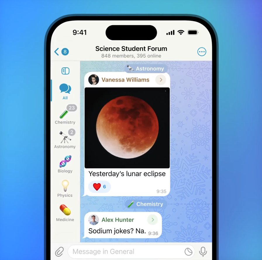 В Telegram появился новый вариант интерфейса с вкладками для групп по темам. Он поможет быстро переходить к нужной теме из списка чатов и переключаться между беседами.