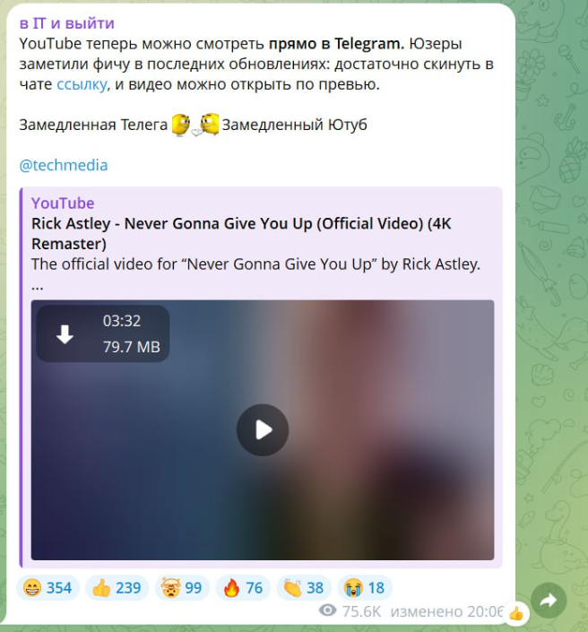 25 февраля пользователи Telegram обнаружили, что теперь на площадке можно смотреть YouTube-видео по превью. Опция работает без VPN. Также в мессенджере можно скачать видео.