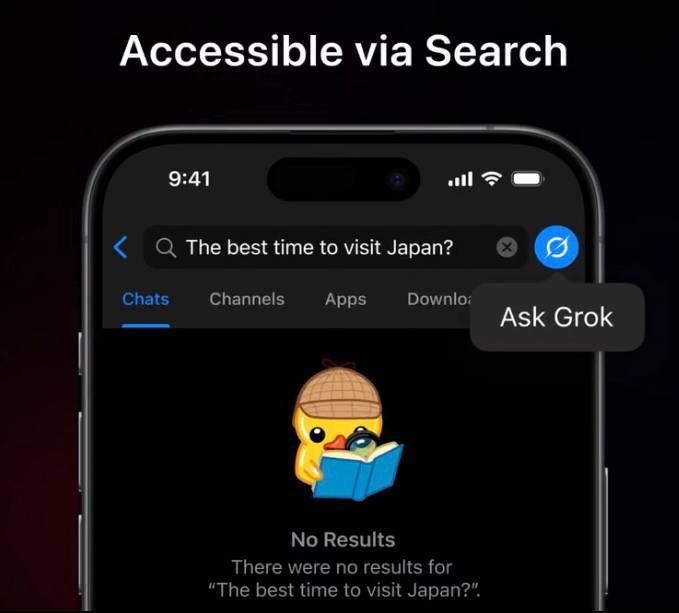Вопросы из глобального поиска — кнопка Grok, которая отправит поисковой запрос в чат-бот Grok.