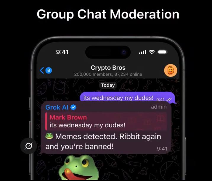 Модерация групповых чатов. На видео показано, как Grok предупреждает пользователя и угрожает баном при повторном нарушении.