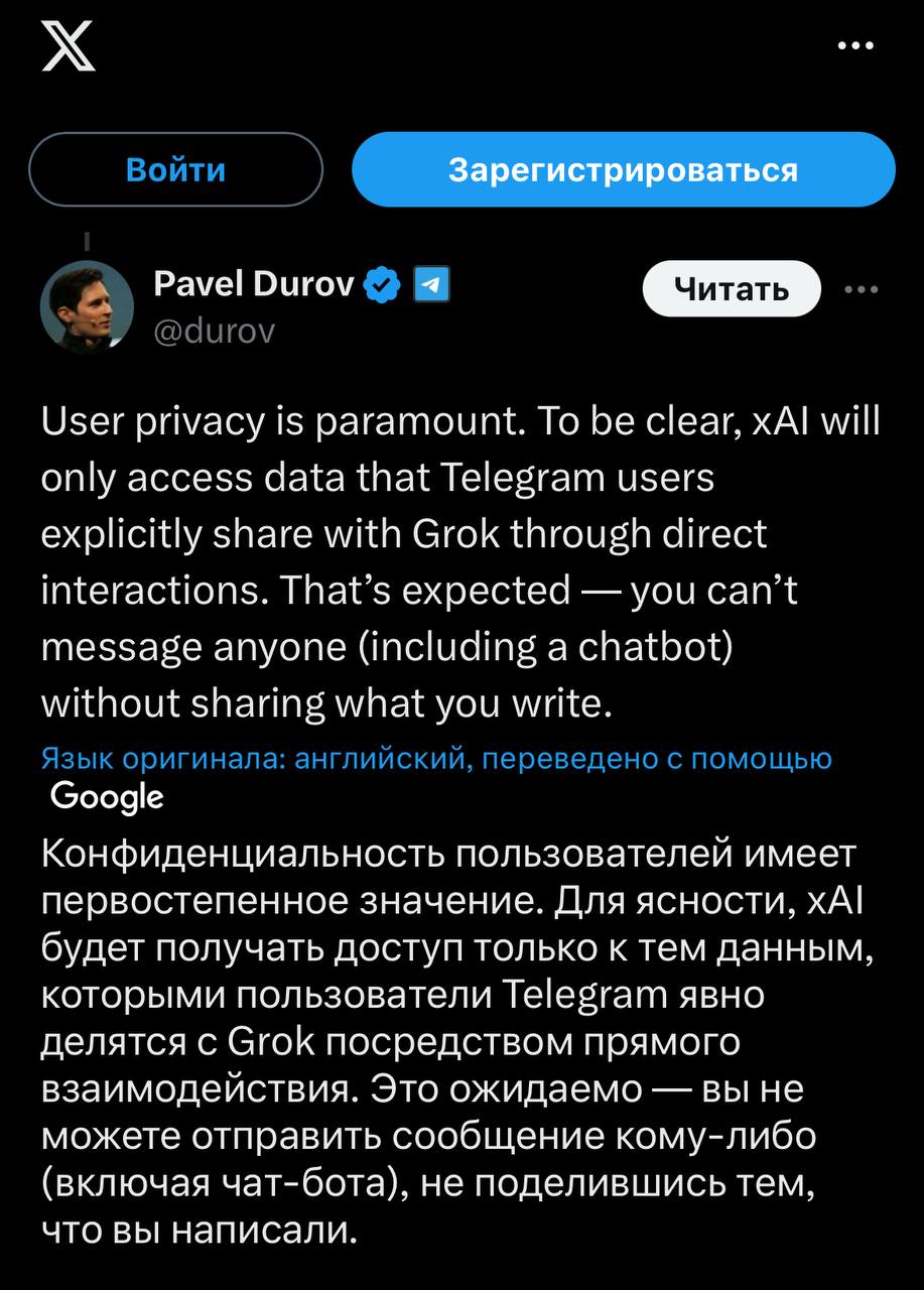 Тем временем Павел Дуров в соцсети X сообщил, что Telegram будет предоставлять Grok только те данные, которыми сам пользователь или его собеседник решили поделиться.