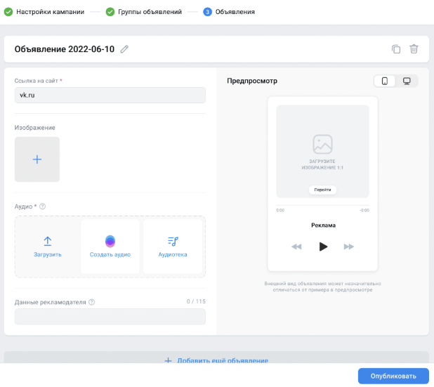 Нажмите «Создать аудио». Если результат вас устраивает, выберите аудиозапись и кликните «Опубликовать». Кампания запустится сразу после модерации, если на счету VK Рекламы достаточно денег.