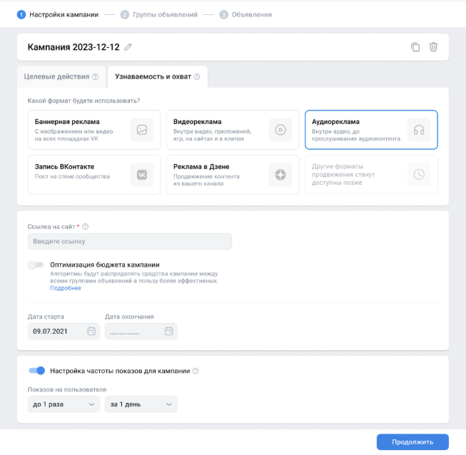 Зайдите во вкладку «Узнаваемость и охват» и выберите формат «Аудиореклама».