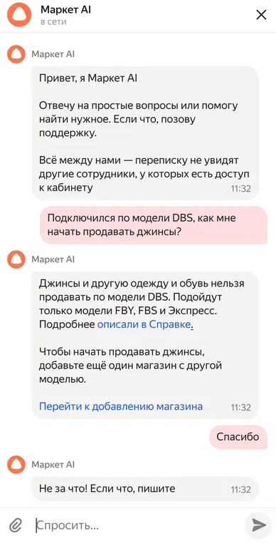 Подбирать модели продаж. Например, если спросить, как начать торговать одеждой на Маркете, AI-ассистент перечислит подходящие модели продаж и добавит ссылку на страницу с подробными данными.