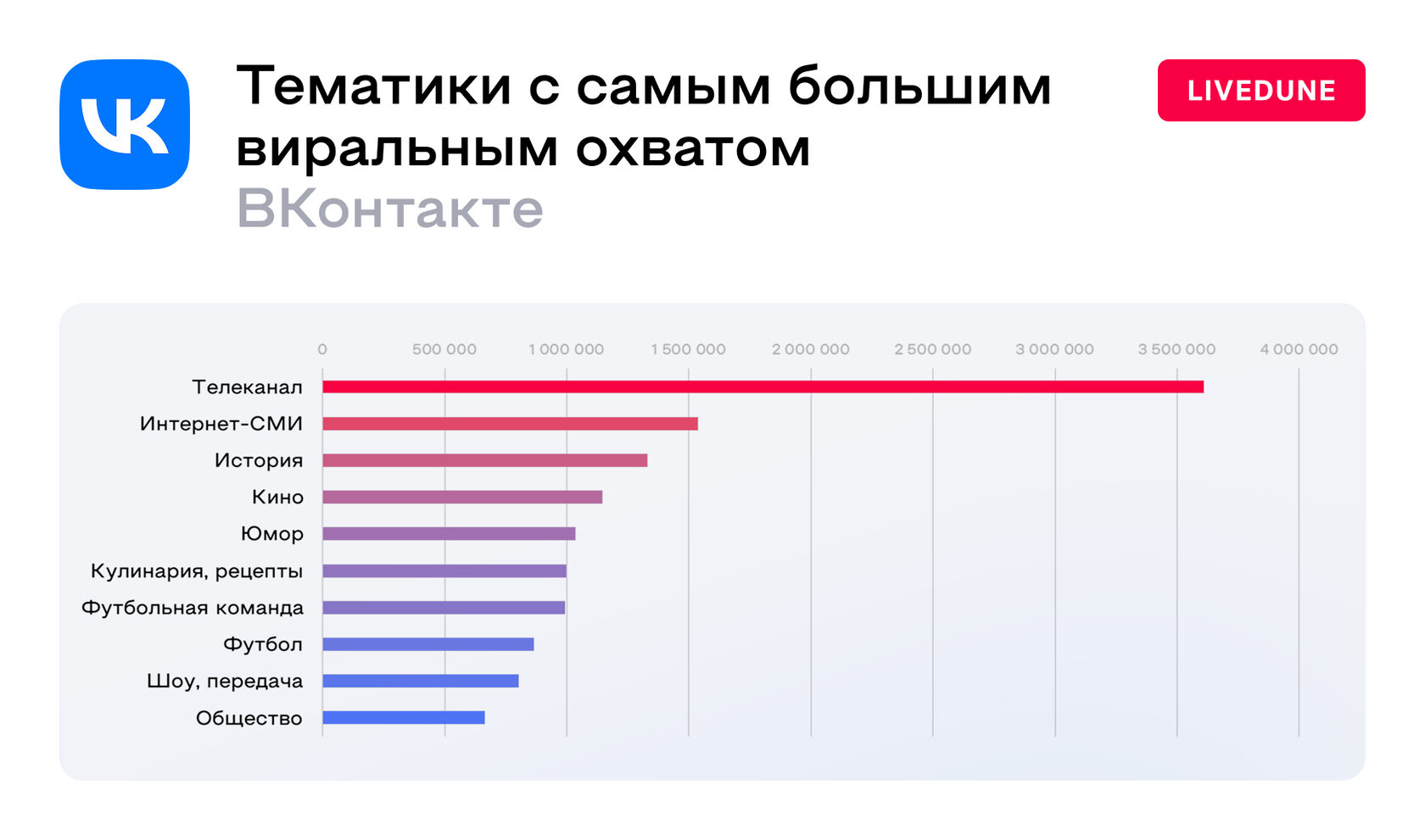 Специалисты LiveDune изучили, какие паблики ВКонтакте получают наибольший виральный охват — иначе говоря, какие тематики сообществ алгоритмы продвигают активнее и почему. Результаты исследования опубликованы в блоге LiveDune.