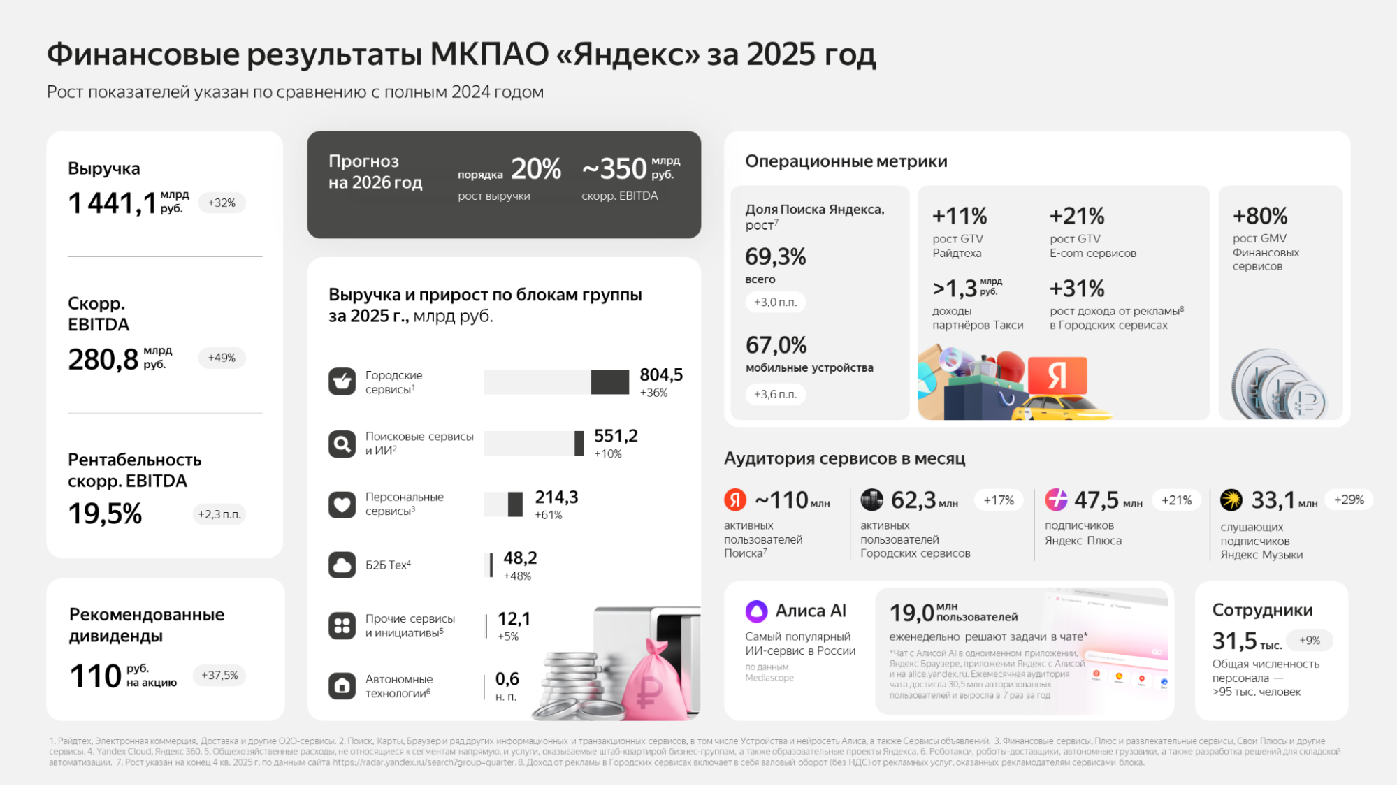 Общая выручка Яндекса за четвертый квартал 2025 года составила 436 млрд рублей — это на 28% больше, чем в прошлом году. А выручка за весь 2025 год составила 1,4 млрд рублей — это на 32% больше, чем в 2024 году.