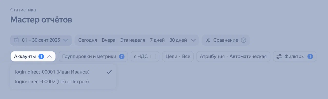 При работе через управляющий аккаунт теперь можно строить отчеты по нескольким аккаунтам. Для этого достаточно выбрать нужные аккаунты и кампании.