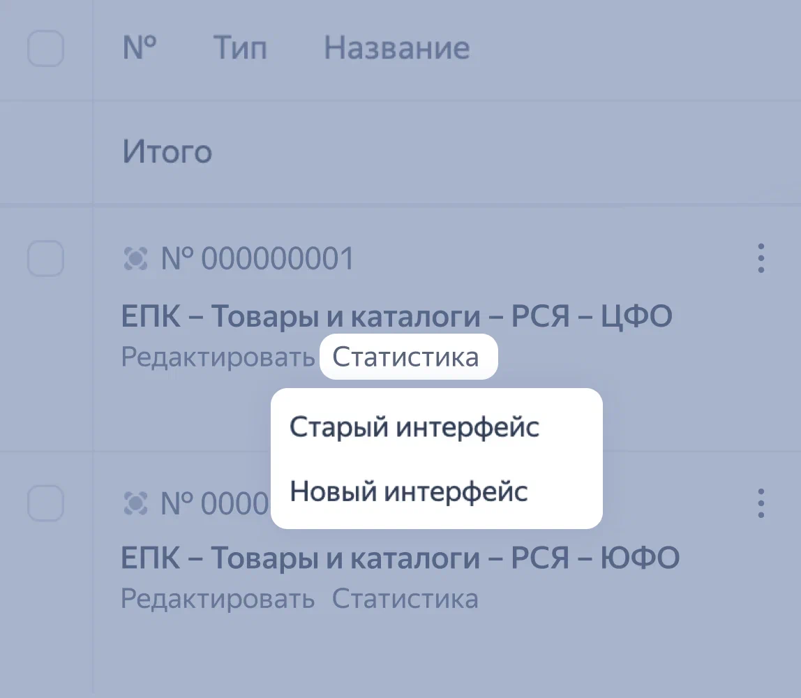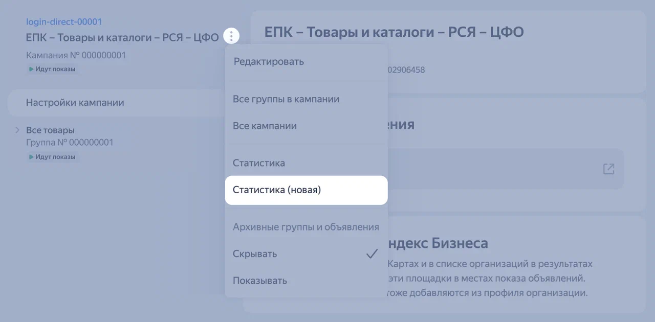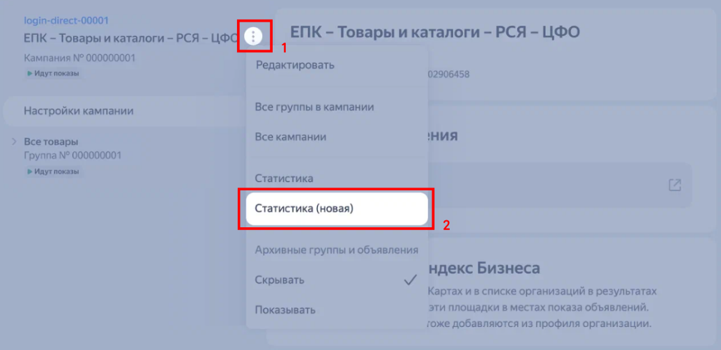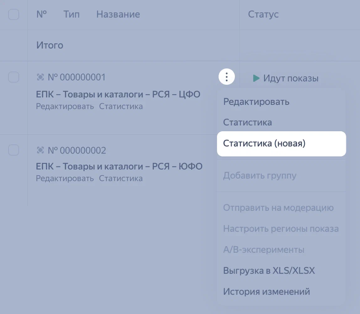 Чтобы перейти в новый Мастер отчетов со страницы редактирования кампании, нужно кликнуть на три точки слева от названия кампании и выбрать «Статистика (новая)».