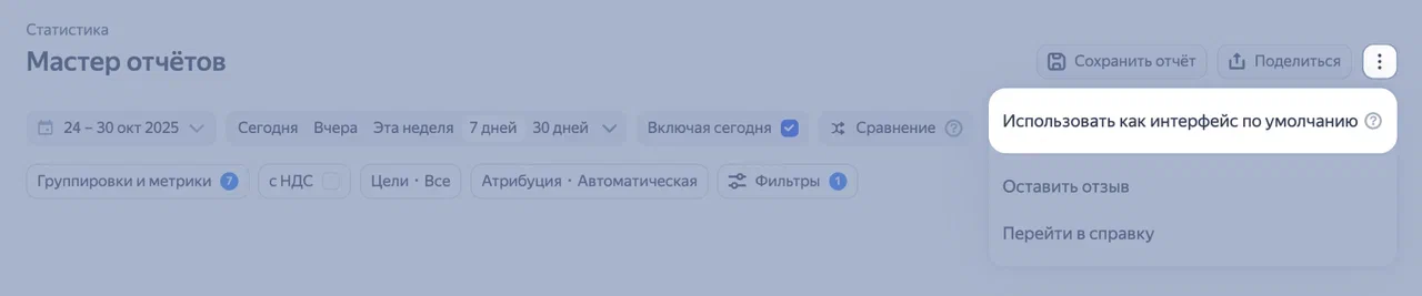 Также новый Мастер отчетов теперь можно указать в качестве интерфейса по умолчанию — все ссылки в интерфейсе будут вести только на него. Для этого нужно в Мастере отчетов нажать на три точки в правом верхнем углу и выбрать «Использовать как интерфейс по умолчанию».