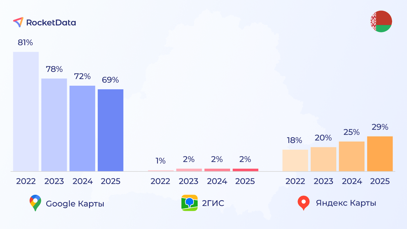 Также аналитики изучили аудиторию геосервисов в Беларуси и Казахстане.