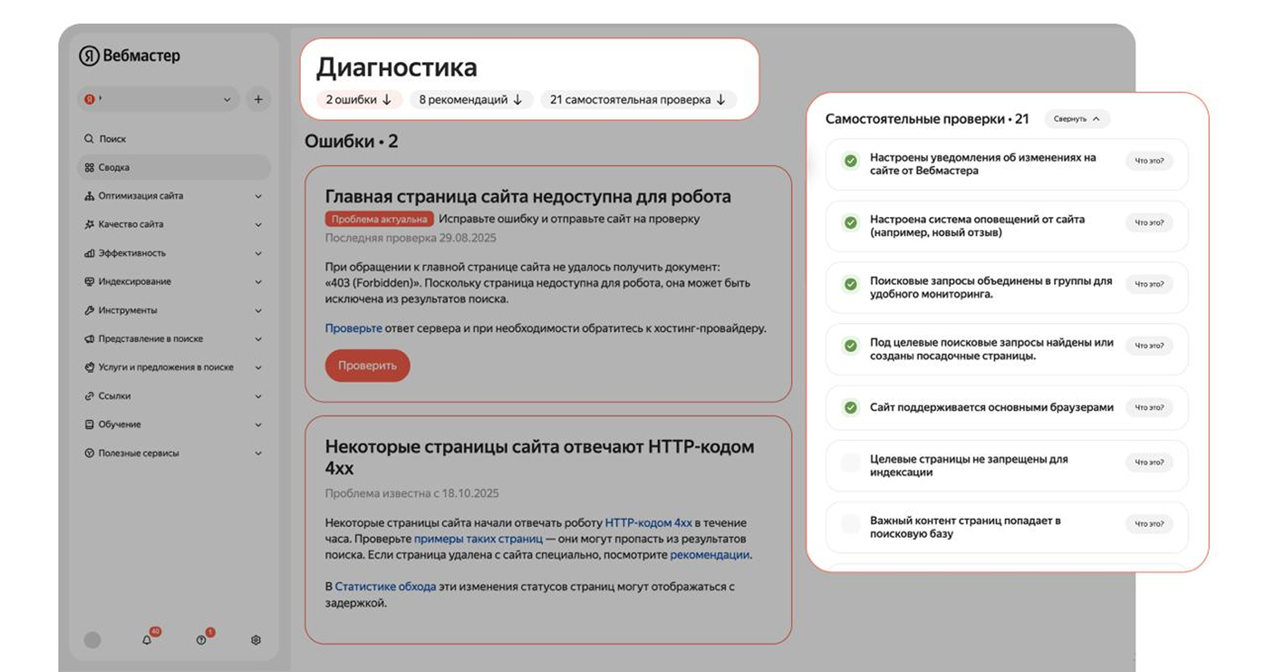 Яндекс выкатил обновленную диагностику сайта в Вебмастере. Теперь все проверки объединены в единый чек-лист, вместо четырех категорий проверки теперь две: ошибки и рекомендации. Благодаря обновлениям пользователи Вебмастера смогут легче находить проблемы и устранять их, сообщается в блоге сервиса.