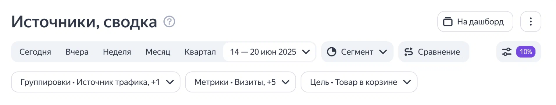 Навигация. Метрики, группировки и цели теперь находятся на панели управления. А выбрать валюту и изменить выборку теперь можно в выпадающем списке настроек.
