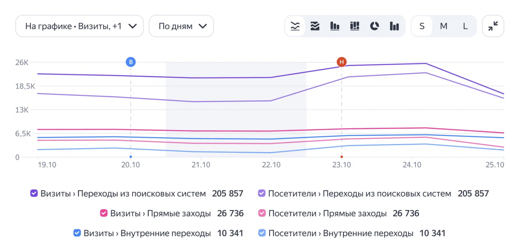 Графики. Появились новые режимы отображения графиков «Столбцы по датам» и «Столбцы с накоплением». При этом на графике можно отобразить несколько Метрик одновременно.