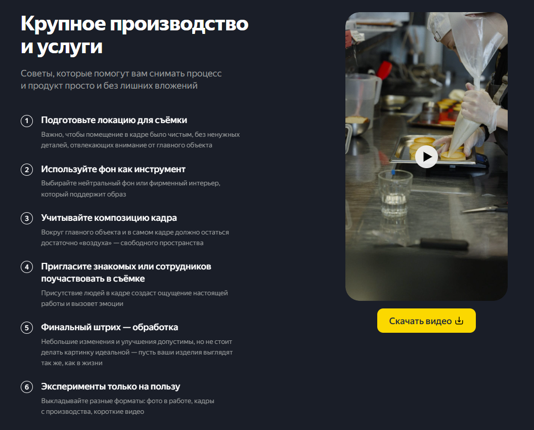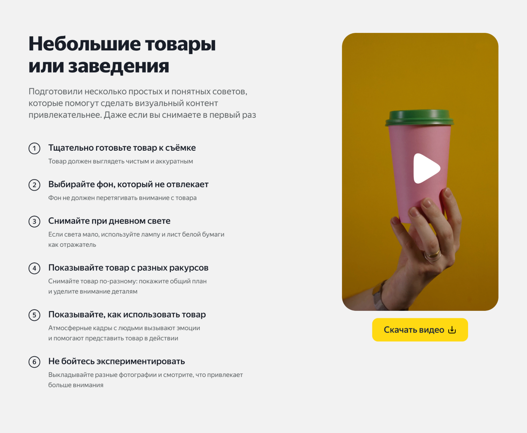 Поэтому Яндекс выпустил видеогайды с простыми приемами для создания качественных фото. Они включают два урока для разных видов бизнеса: