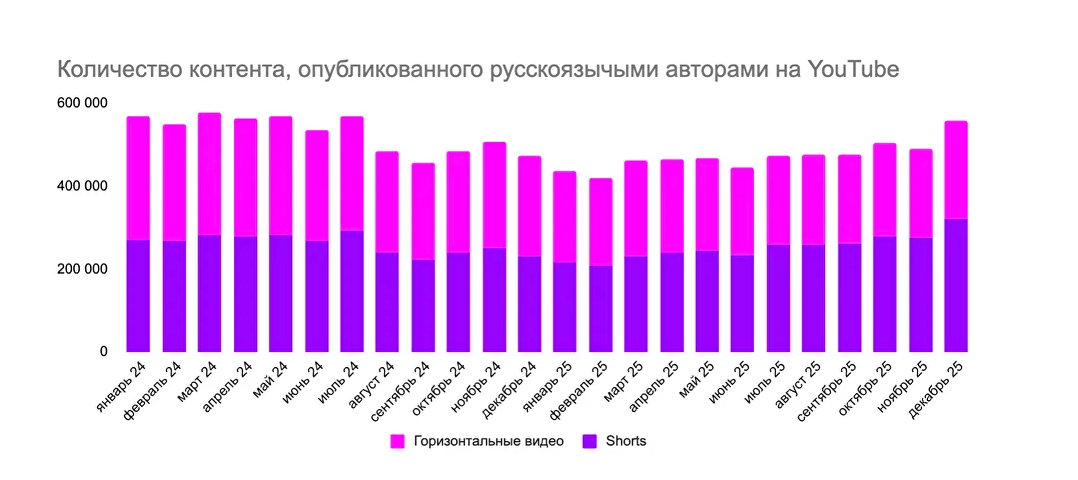 Третья — адаптация и рост. Хотя общий объем публикаций снижался почти весь 2025 год, к его концу ситуация изменилась. В декабре 2025 года было загружено 556 493 видео — максимум за полтора года.