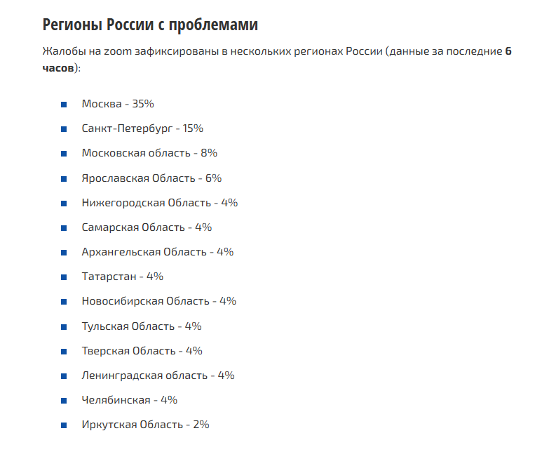 По данным «Сбой.рф», сегодня на работу Zoom жаловались около 300 раз. Больше всего — в Москве, Санкт-Петербурге и Московской области. О сбоях рассказывают и жители других регионов: